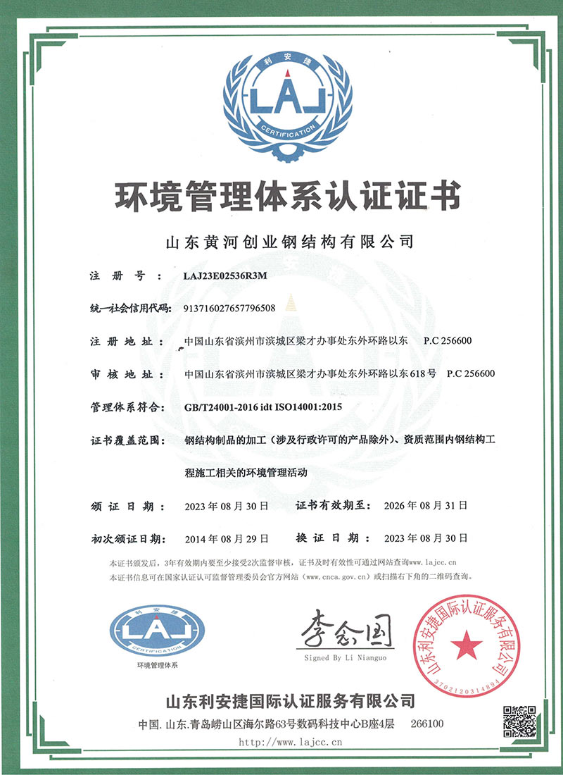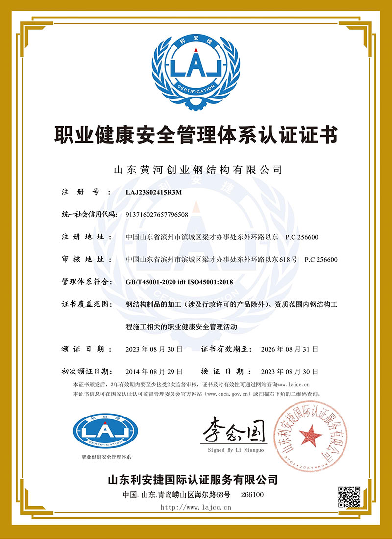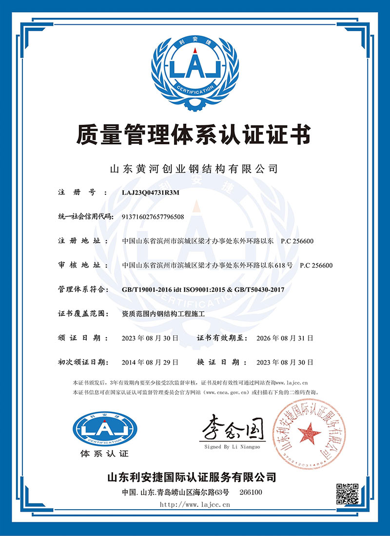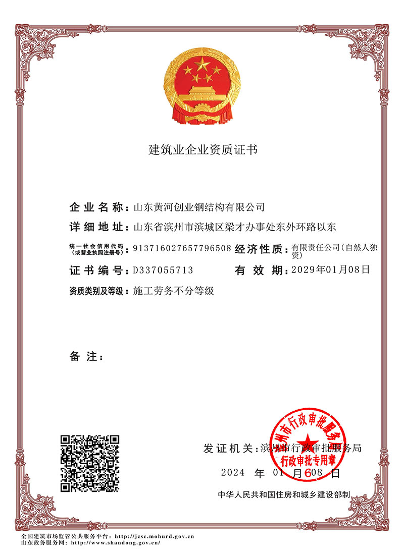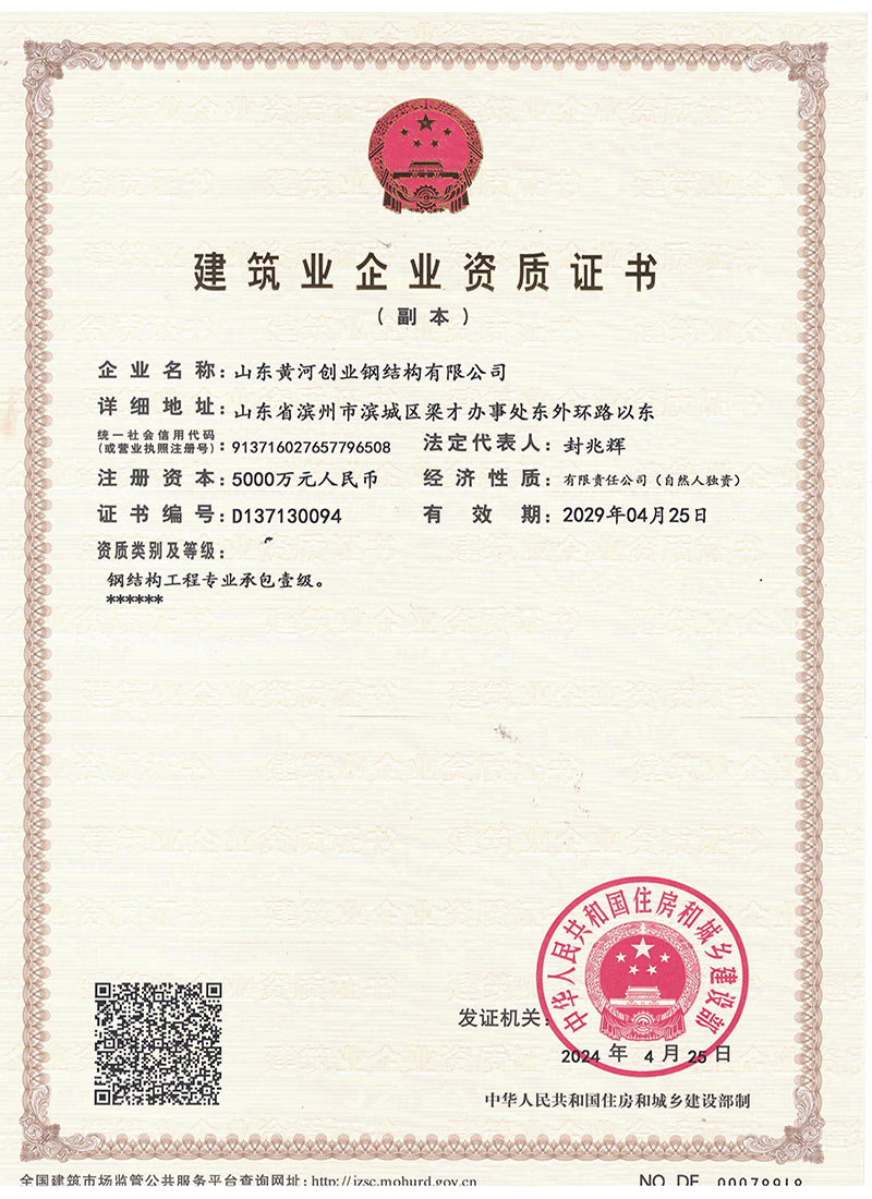 山东黄河创业钢结构有限公司创建于2004年, 2008年成为钢结构专业承包制作和安装壹级企业,施工总承包贰级资质,通过了ISO9001质量体系认证。公司占地面积20万平方米,年生产能力20万余吨,有多条轻钢生产线,重钢生产线、箱型钢生产线、管桁架生产线,多台先进的高速激光设备,另外还有电力、通讯塔、大型装备配套生产线。现企业注册资金5000万元,有固定资产2.5亿元。各类工程、技术人员300余人,高级职称15人,中级职称45人,初级100人。同时公司拥有合格上岗技术人员200人。公司主要设计、生产、制作及安装各种装配式结构,广泛用于各类工业大跨度、超高门式钢架厂房,多高层建筑,电力、通讯塔、桥梁、大型装备等重钢领域与民用建筑领域,是黄河以北主要钢结构生产、安装基地之一。