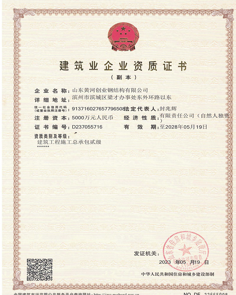 公司为了打造“黄河创业”品牌,在各级主管部门的领导下,在激烈的市场竞争中,自小至大,自弱至强得到长足发展,经过不断努力,公司先后被山东省列为重点工程企业;山东省级先进企业;诚信企业;连续多年被授予滨州市守合同、重信用企业;获得金融机构信用AA级证书;滨州市建筑重点企业,2016年度被授予“滨州市建筑重点企业”、“滨州市建筑优秀企业”、“滨州市建筑业诚信企业”、“山东省建筑业诚信企业”,2021年被市局评为“滨州市钢结构协会主任委员单位”。连续多年被评为“突出纳税贡献户”。2022年被市应急管理局评为“安全生产标准化三级企业”,多年被评为“滨州市建筑业协会优秀会员单位,形成了“黄河创业”的品牌,建设项目参加QC小组竞赛也多获得二等奖、三等奖。